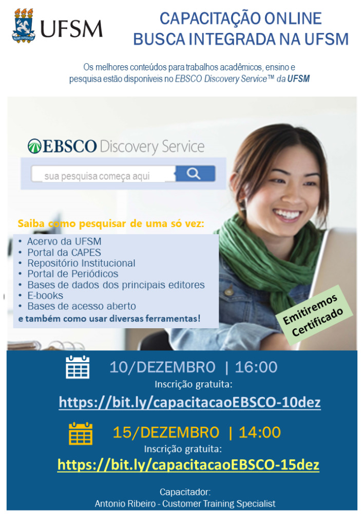 A Biblioteca Central da UFSM, por meio da Divisão de Referência, convida todos os estudantes dos cursos EaD da UAB/UFSM para a capacitação online Busca Integrada na UFSM – EBSCO Discovery Service, que será ofertada em duas turmas, nos dias 10 e 15 de dezembro de 2020, conforme segue: