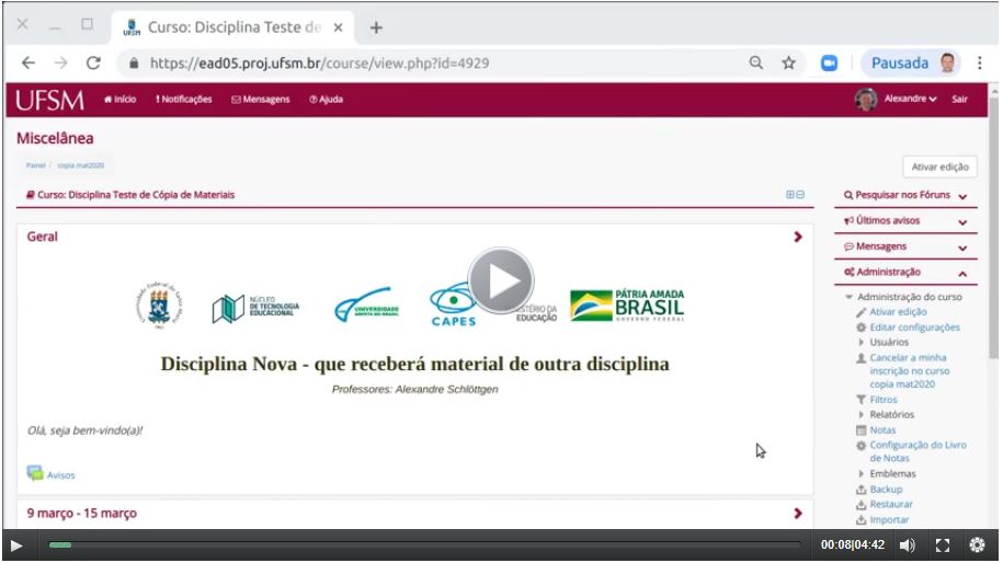 - Videoaula com os procedimentos de cópia de conteúdo entre disciplinas do Moodle UFSM.