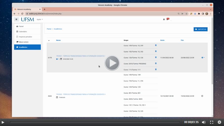 - Videotutorial que ensina o professor da UFSM a importar (criar) turmas e disciplinas do Sistema Acadêmico da UFSM (SIE) para o Ambiente Moodle Presencial.