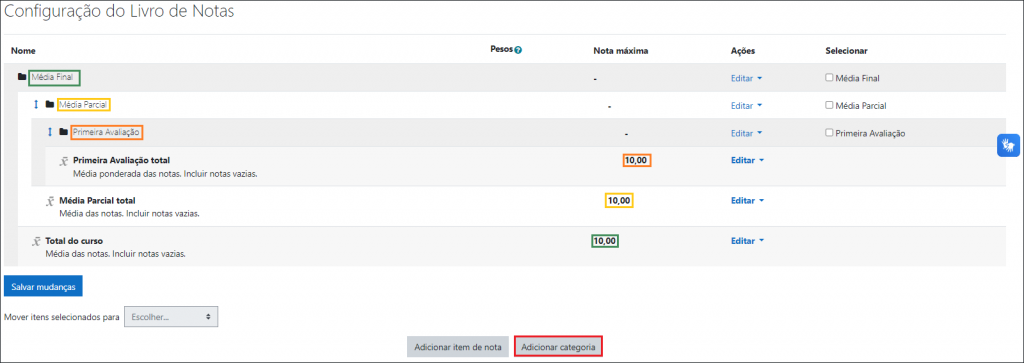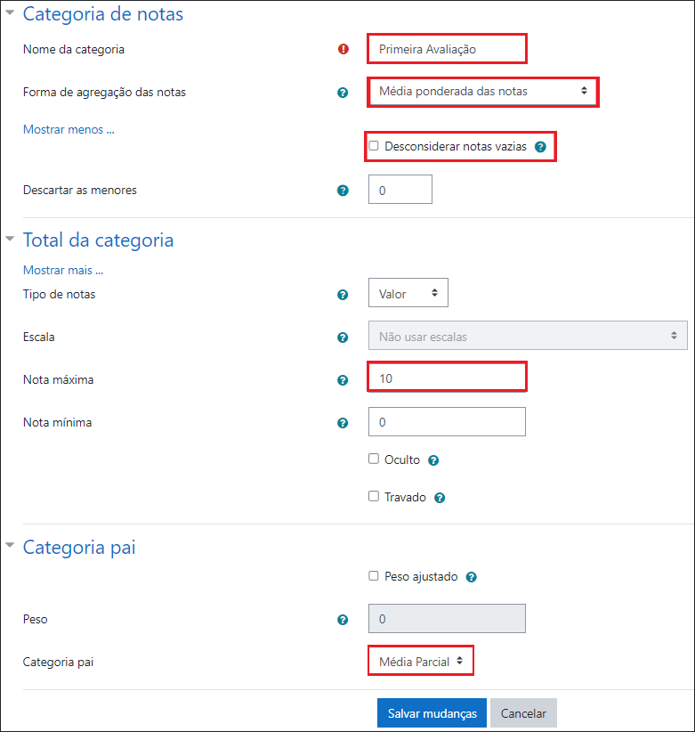 Nesta nova categoria são necessárias alterações em “Nome da Categoria” com o nome igual a “Primeira Avaliação”, “Forma de agregação das notas” igual a “Média ponderada das notas”, clicar em “Mostrar mais …” e desmarcar a opção “Desconsiderar notas vazias”, em “Total da categoria” deixar a nota máxima com o valor “10”, informar qual é a “Categoria pai” selecionando “Média Parcial” e salvar as mudanças.