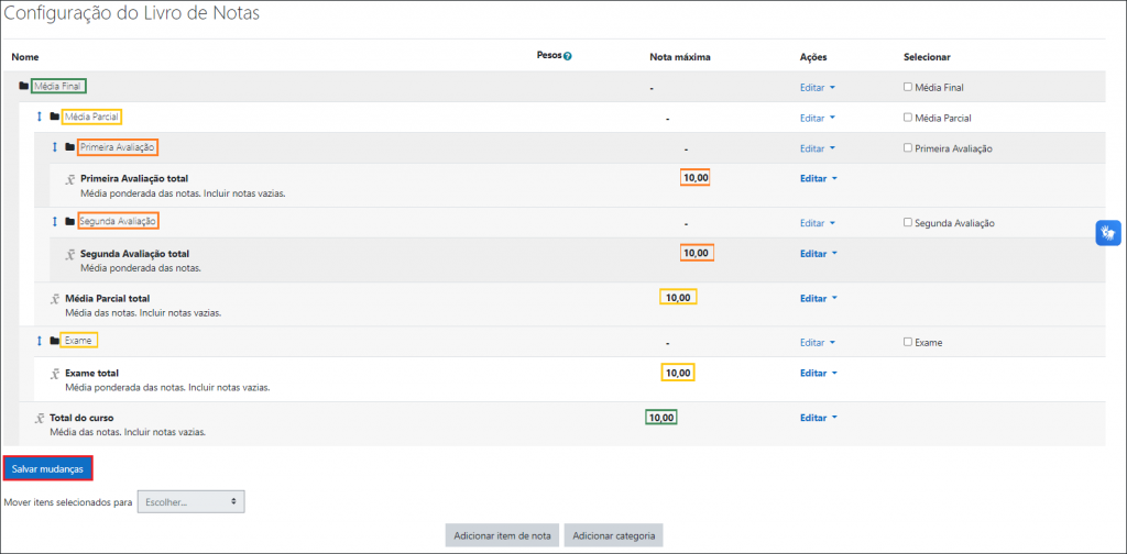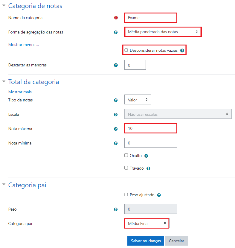 Como última categoria, são necessárias alterações em “Nome da Categoria” com o nome igual a “Exame”, “Forma de agregação das notas” igual a “Média ponderada das notas”, clicar em “Mostrar mais …” e desmarcar a opção “Desconsiderar notas vazias”, em “Total da categoria” deixar a nota máxima com o valor “10”, informar qual é a “Categoria pai” selecionando “Média Final” e salvar as mudanças.