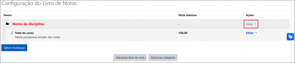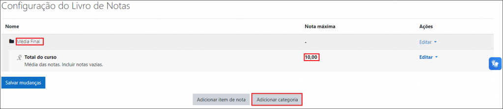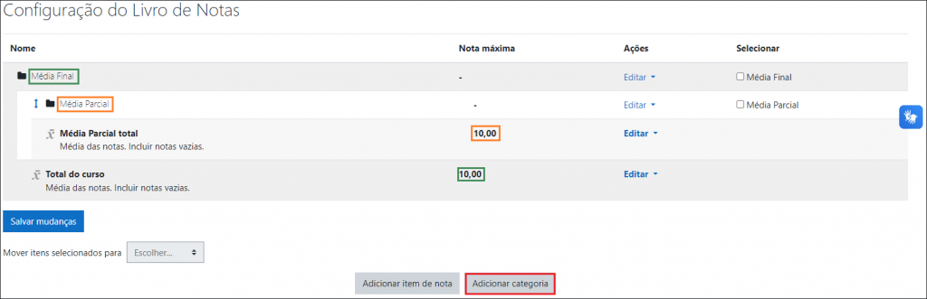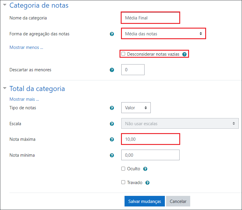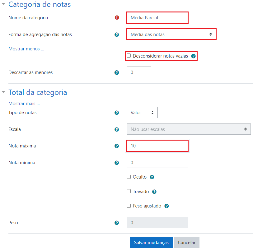 Nesta nova categoria são necessárias alterações em “Nome da Categoria” com o nome igual a “Média Parcial”, “Forma de agregação das notas” igual a “Média das notas”, clicar em “Mostrar mais …” e desmarcar a opção “Desconsiderar notas vazias”, em “Total da categoria” deixar a nota máxima com o valor “10” e salvar as mudanças.