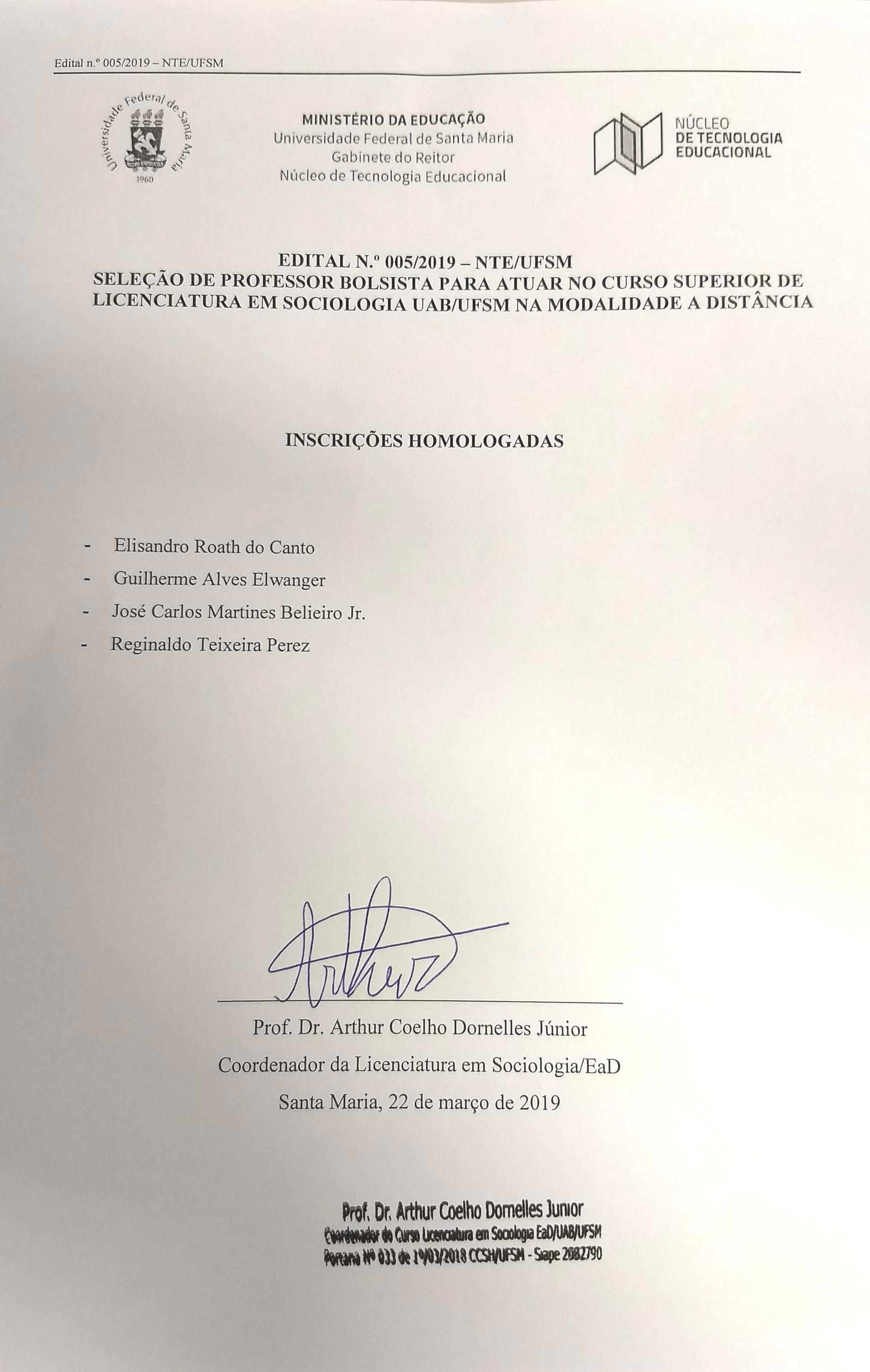 O Núcleo de Tecnologia Educacional e a Coordenação da Universidade Aberta do Brasil na UFSM, tornam pública a abertura do Processo Seletivo Simplificado para provimento de 01 (uma) vaga para Professor Formador na condição de bolsista, para atuar no Curso de Licenciatura em Sociologia, na Modalidade a Distância, dentro do Programa Universidade Aberta do Brasil — UAB, no âmbito da Universidade Federal de Santa Maria — UFSM, observando as disposições contidas neste Edital, bem como as normas estabelecidas na Portaria Capes nº 183, de 21 de outubro de 2016, Portaria Capes nº 15, de 23 de janeiro de 2017 e Portaria Capes nº 249, de 8 de novembro de 2018.