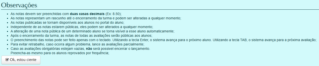 Para realizar os procedimentos a seguir, se faz importante entender sobre algumas padronizações de inserção dos valores das notas, bem como alguns procedimentos, conforme a imagem abaixo.