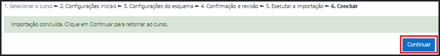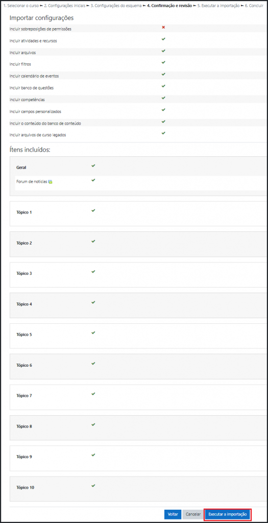 Após estas etapas, você verá a tela de confirmação das opções selecionadas anteriormente. Verifique se todos os recursos e atividades desejados foram marcados corretamente para a importação e clique em “Executar a importação”.
