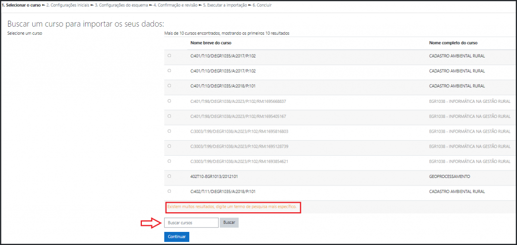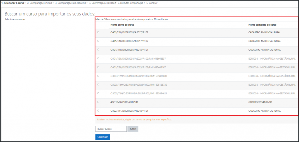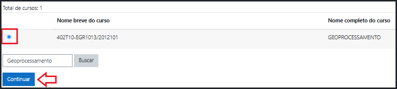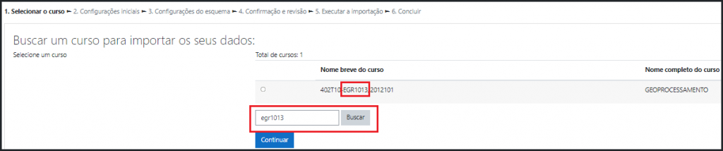 Após esta etapa, selecione o curso de origem a partir do qual deseja importar recursos e atividades e clique em continuar.