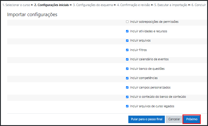 Na próxima tela, você poderá selecionar cada um dos tópicos que desejar importar. Feito isso, clique em “Próximo” novamente.