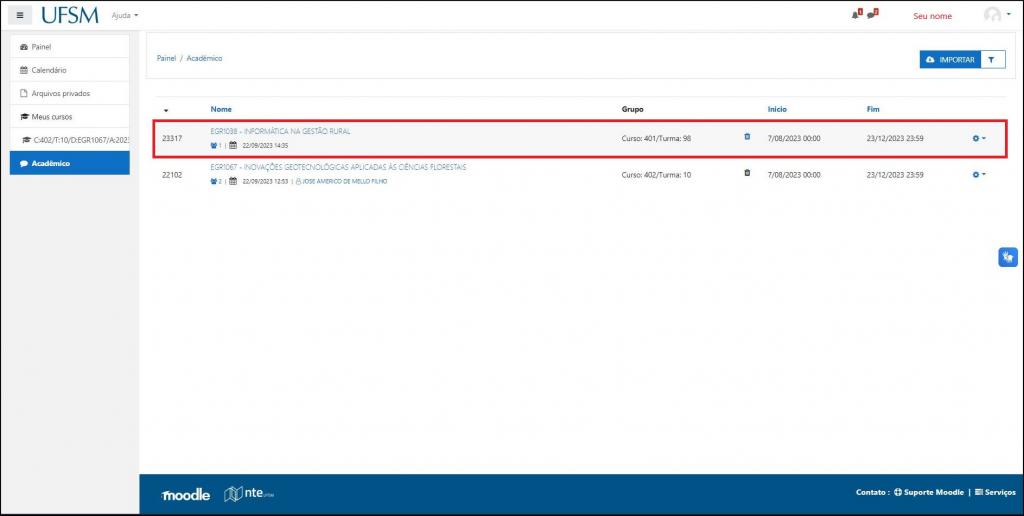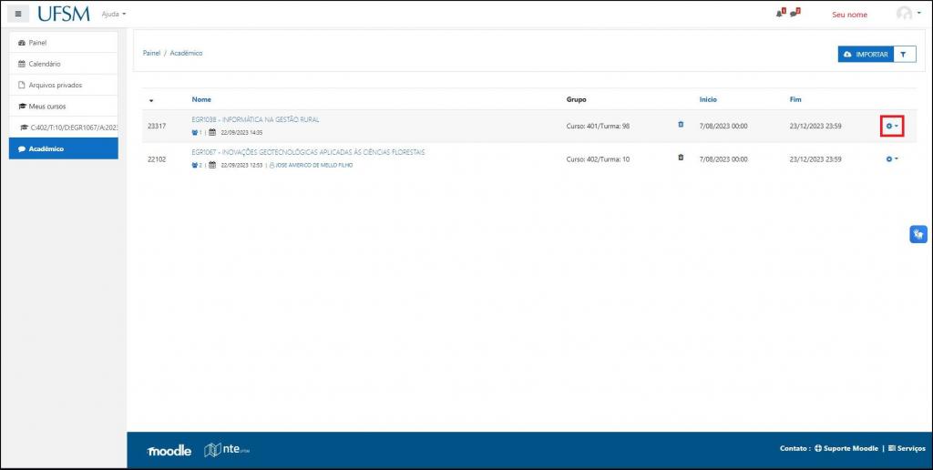 Na listagem de disciplinas, identifique recentemente importada e clique na engrenagem da direita.