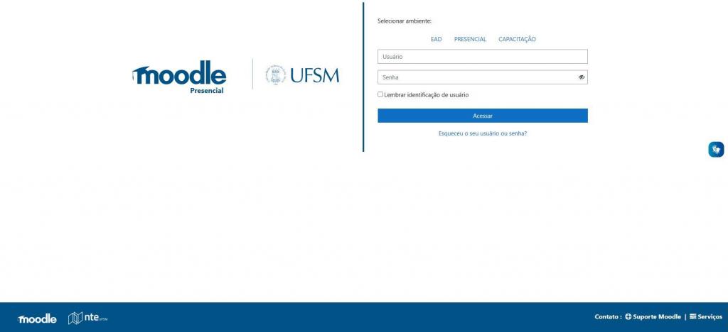 1 – Acesse o site da UFSM. 2 – Clique em “Menu”. 3 – Em “Acesso rápido”, clique em “Estudantes”. 4 – Clique em “Moodle”. 5 – Clique no ícone “Presencial”. 6 – Informe seus dados de acesso (o mesmo do portal estudantil). 7 – Pronto! Você está no Ambiente Virtual de Ensino e Aprendizagem (AVEA) Moodle.