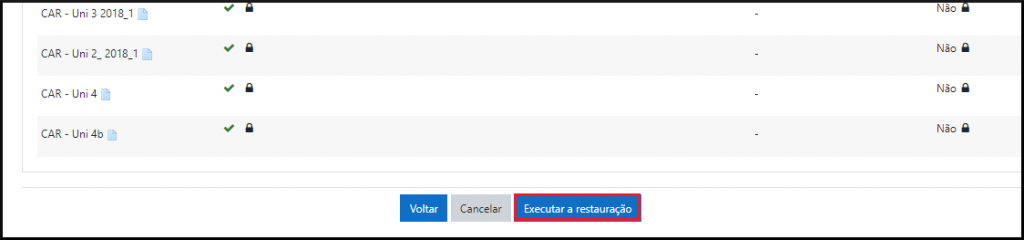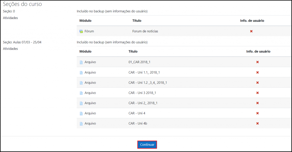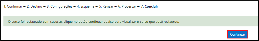 14. Aguarde até que o processo de restauração seja concluído e clique em “Continuar”. Isso pode levar algum tempo, dependendo do tamanho da disciplina e da quantidade de dados a serem restaurados.
