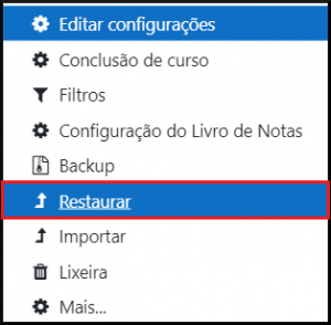 2. Dentro da disciplina, clique na engrenagem no canto superior direito, localize e clique no item “Restaurar” .