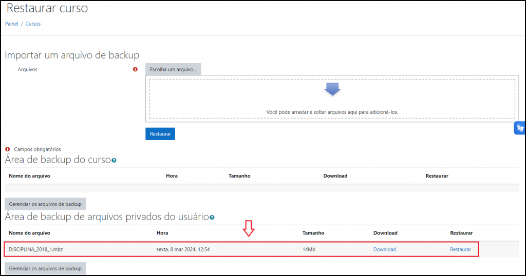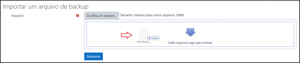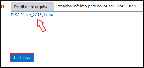 Para restaurar uma disciplina no Moodle a partir de um backup, siga estes passos: