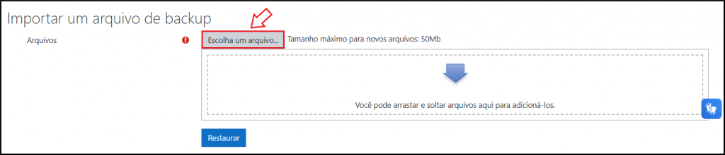 4. Senão, clique em “escolha um arquivo” ou arraste o arquivo do backup salvo/recebido.