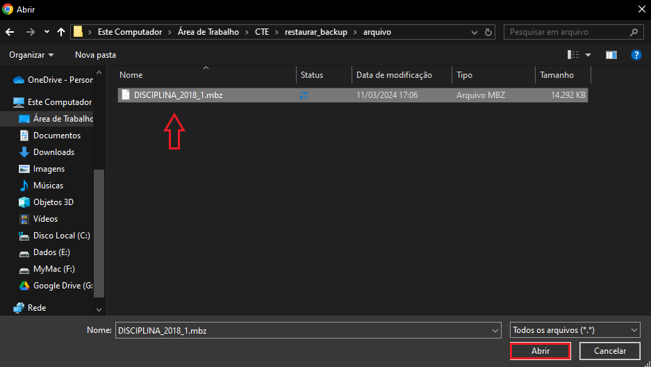 6. Localize o arquivo de backup no local salvo e clique em “Abrir”.