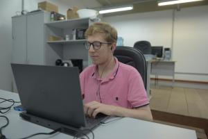 Na Coordenadoria de Tecnologia Educacional, temos um colega com Deficiência Visual, o estagiário da área de Tecnologia da Informação, Lorenzo Facco Comunello.