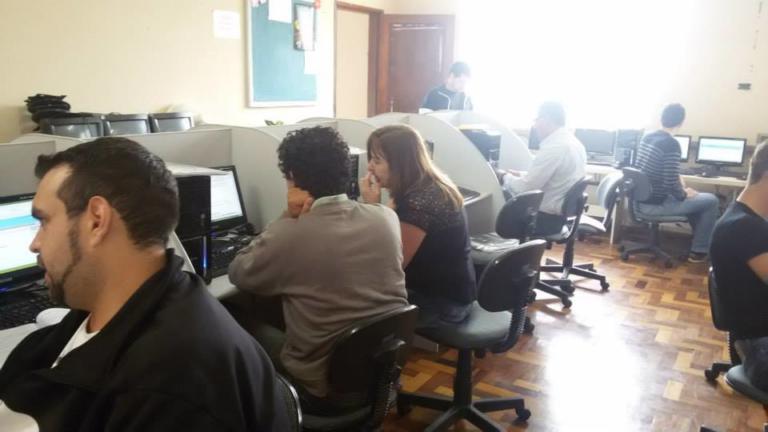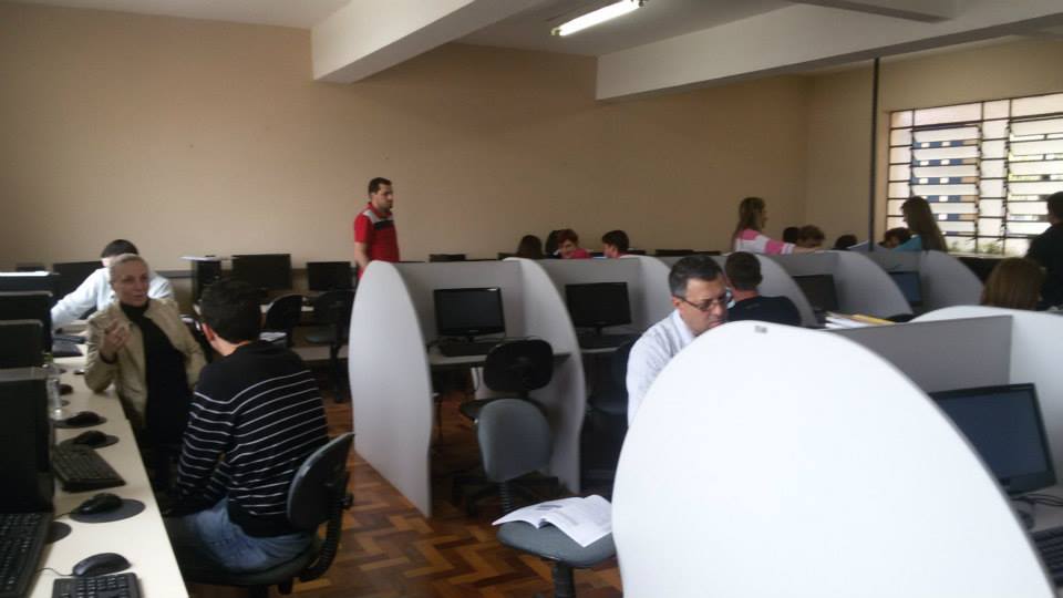 Sala de informática e pessoas em cantos do cômodo