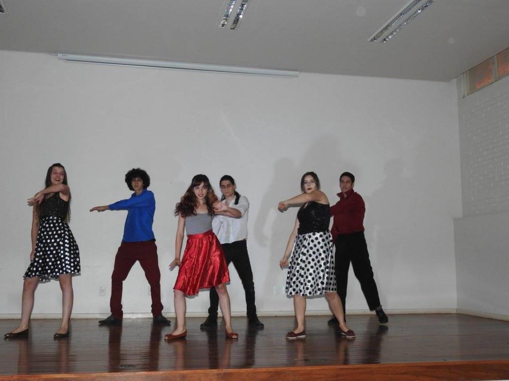 Seis estudantes fantasiados dançando no palco