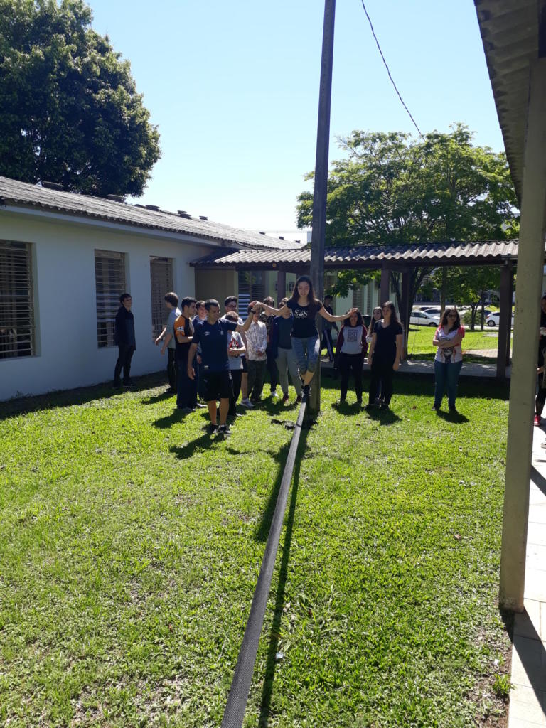 Menina andando em slack line com turma assistindo no pátio do Colégio
