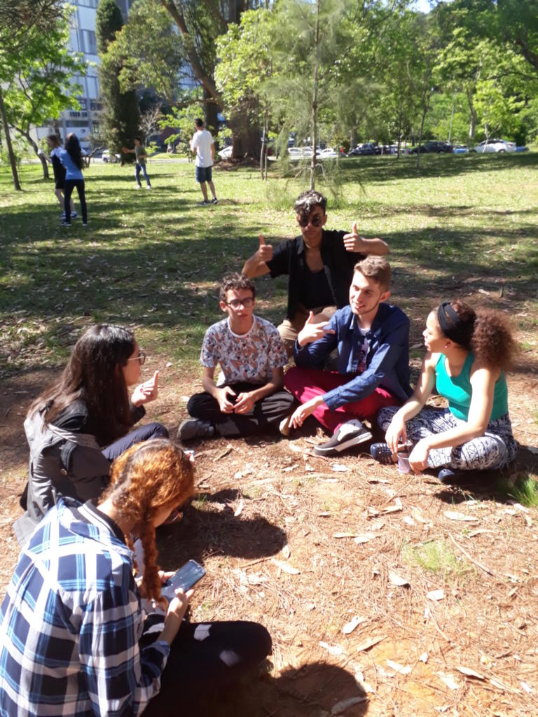 Pessoas sentadas no bosque