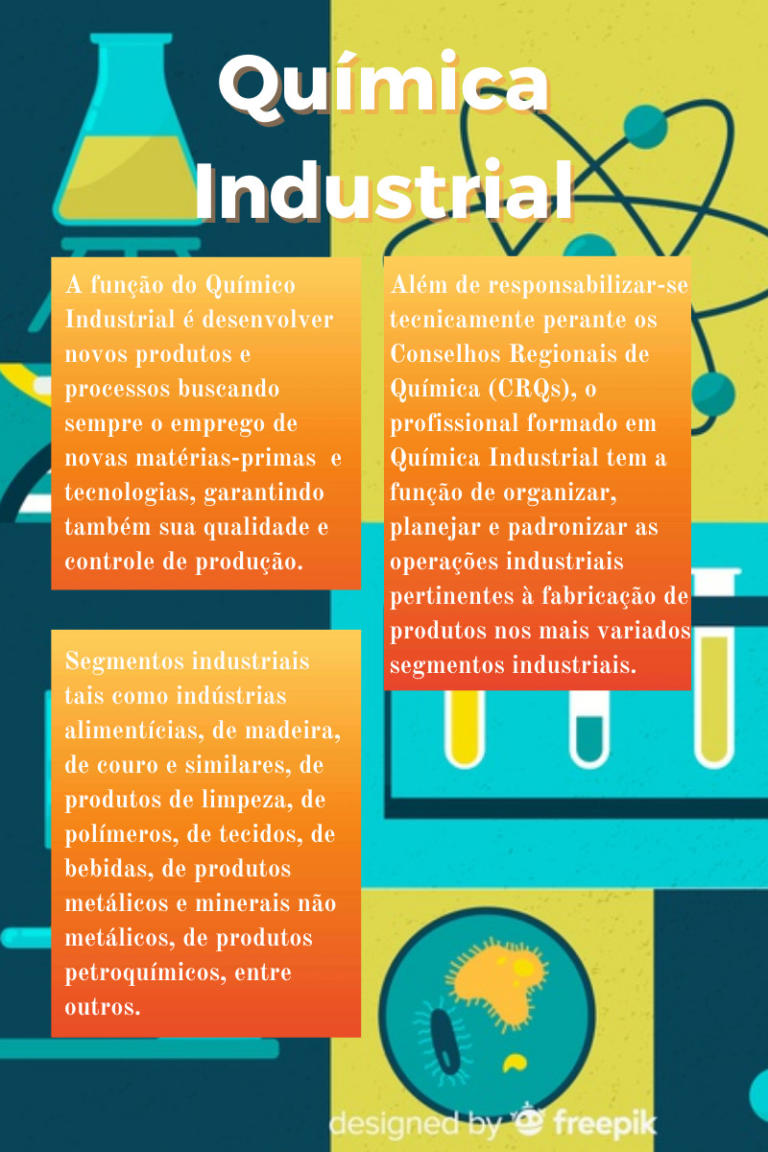 A função do Químico Industrial é desenvolver novos produtos e processos buscando sempre o emprego de novas matérias-primas e tecnologias, garantindo também sua qualidade e controle de produção. Além de responsabilizar-se tecnicamente perante os Conselhos Regionais de Química (CRQs), o profissional formado em Química Industrial tem a função de planejar, organizar e padronizar as operações industriais pertinentes à fabricação de produtos nos mais variados segmentos industriais, como nas indústrias de alimentos, de madeira, de couro e similares, de produtos de limpeza, de polímeros, de tecidos, de bebidas, de produtos metálicos e minerais não metálicos, de produtos petroquímicos, entre outras.