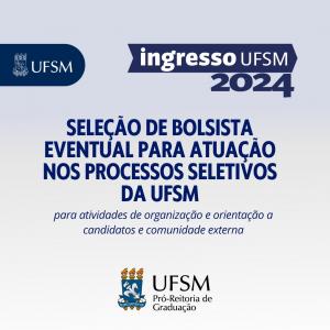 A Pró-Reitoria de Graduação, PROGRAD, da Universidade Federal de Santa Maria, UFSM, torna público o Edital de seleção de bolsista (eventual) para atuar no auxílio a processos seletivos de ingresso da UFSM e atividades correlatas.