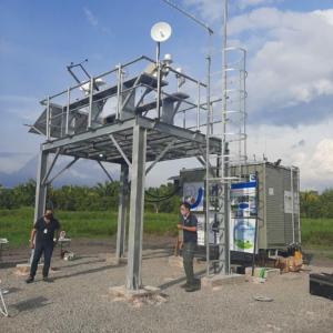 Buscando melhorar isso, e aproveitando a parceria com o INPE, pudemos inaugurar em novembro de 2020 o Observatório Atmosférico da Amazônia (OAA) na Fazenda Experimental da UFOPA, distante 36 km do centro da cidade de Santarém- PA. O OAA possui uma torre meteorológica de 10 metros realizando medidas de vento, precipitação, temperatura do ar e do solo, umidade, pressão atmosférica e radiação solar global. Além disso, conta também com a plataforma solarimétrica do INPE com medidas de radiação solar global, direta, difusa e infravermelha, medidas de aerossóis atmosféricos por um espectrômetro Cimel da rede Aeronet da NASA, câmera All sky tirando fotos da cobertura de nuvens a cada 15 minutos e um Espectrofotômetro Brewer que será concertado ainda esse ano com recursos da Organização Meteorológica Mundial (OMM) para realizar medidas de conteúdo de ozônio, radiação UV, aerossóis atmosféricos e NO2.