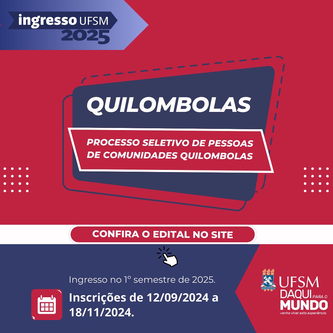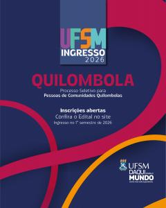 A Universidade Federal de Santa Maria, UFSM, por meio da Pró-Reitoria de Graduação, PROGRAD, torna público que, no período de 09 de outubro a 16 de novembro de 2025, estarão abertas as inscrições para o Processo Seletivo de Ingresso de Pessoas de Comunidades Quilombolas UFSM 2026.