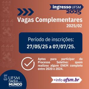 O processo seletivo de Vagas Complementares tem o objetivo de preencher vagas não ocupadas pelos principais processos seletivos da UFSM: SiSU e Vestibular.