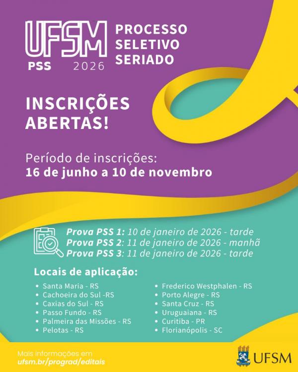 - Abertura de inscrições ao Edital de Vagas Complementares em ufsm.br/prograd, para quem realizou algum Enem completo nas últimas 5 edições e obteve 300 pontos ou mais na redação.