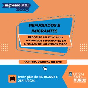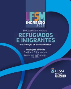 A Universidade Federal de Santa Maria, por meio da Pró-Reitoria de Graduação torna pública a abertura do Edital do Processo Seletivo para Ingresso de Refugiados e Imigrantes em situação de vulnerabilidade UFSM 2026, com objetivo de preenchimento de 97 vagas em 67 cursos de graduação desta Universidade, para ingresso em 2026. Acesse o Edital e o Link de Inscrição AQUI.