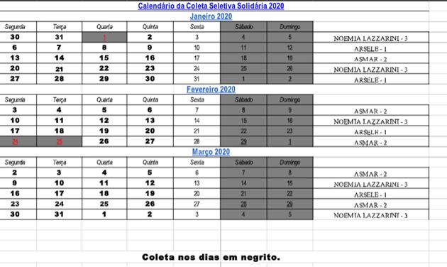 Calendário da coleta seletiva