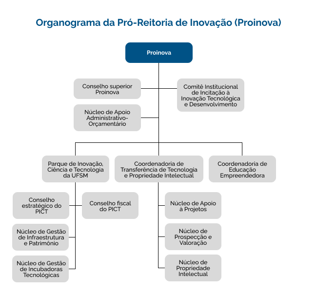 A partir da criação da Proinova, a estrutura ganha novos núcleos e reconfigura alguns já existentes na Agittec. Essas alterações buscam contemplar todas as faces da inovação e do empreendedorismo dentro da UFSM.