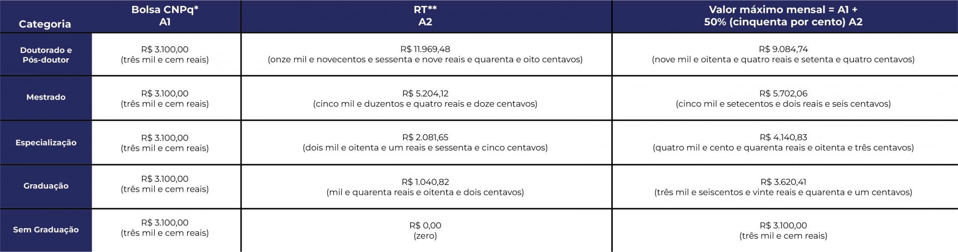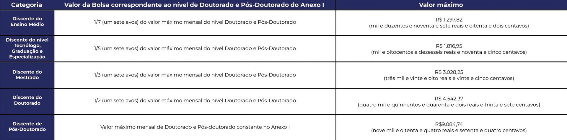 Assim, os valores máximos previstos no Anexo I da Resolução UFSM n. 089 passam a ser calculados usando como base o valor de R$3.100,00 (três mil e cem reais), que corresponde ao nível de Doutorado. Ainda, os valores máximos previstos no Anexo II da Resolução UFSM n. 089 passam a ser calculados usando como base o valor máximo mensal do nível de Doutorado e Pós-Doutorado já reajustados no Anexo I conforme valores da Portaria mencionada.