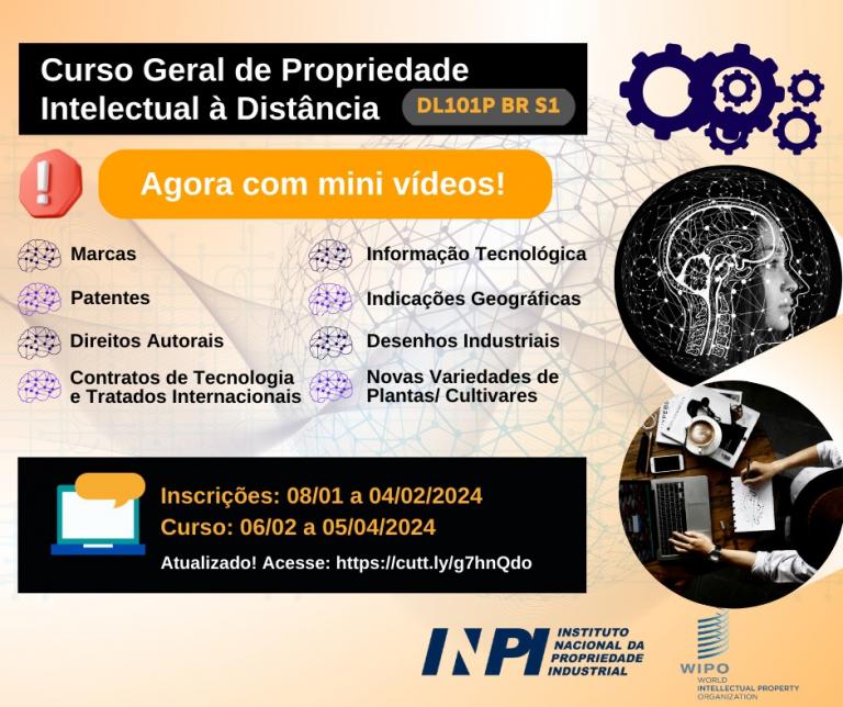 O Instituto Nacional da Propriedade Industrial (INPI) irá promover a primeira edição de 2024 do Curso Geral de Propriedade Intelectual à Distância DL 101P BR. O curso irá oferecer uma série de vídeos que abordarão sobre marcas, patentes, direitos autorais, contratos de tecnologia e tratados internacionais, informação tecnológica, indicações geográficas, desenhos industriais e novas variedades de plantas/cultivares.