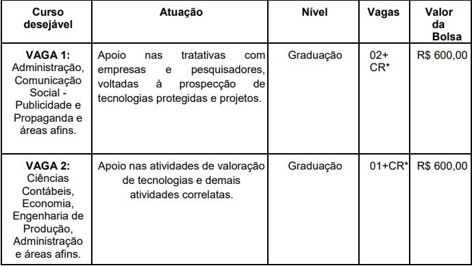 Pró-Reitoria de Inovação e Empreendedorismo está com oportunidade de bolsas abertas nas áreas de Administração, Comunicação, Contábeis, Economia, Engenharia de Produção, Direito ou áreas afins. Ao todo, são 4 vagas distribuídas para atuação no Núcleo de Prospecção e Valoração e Jurídico.