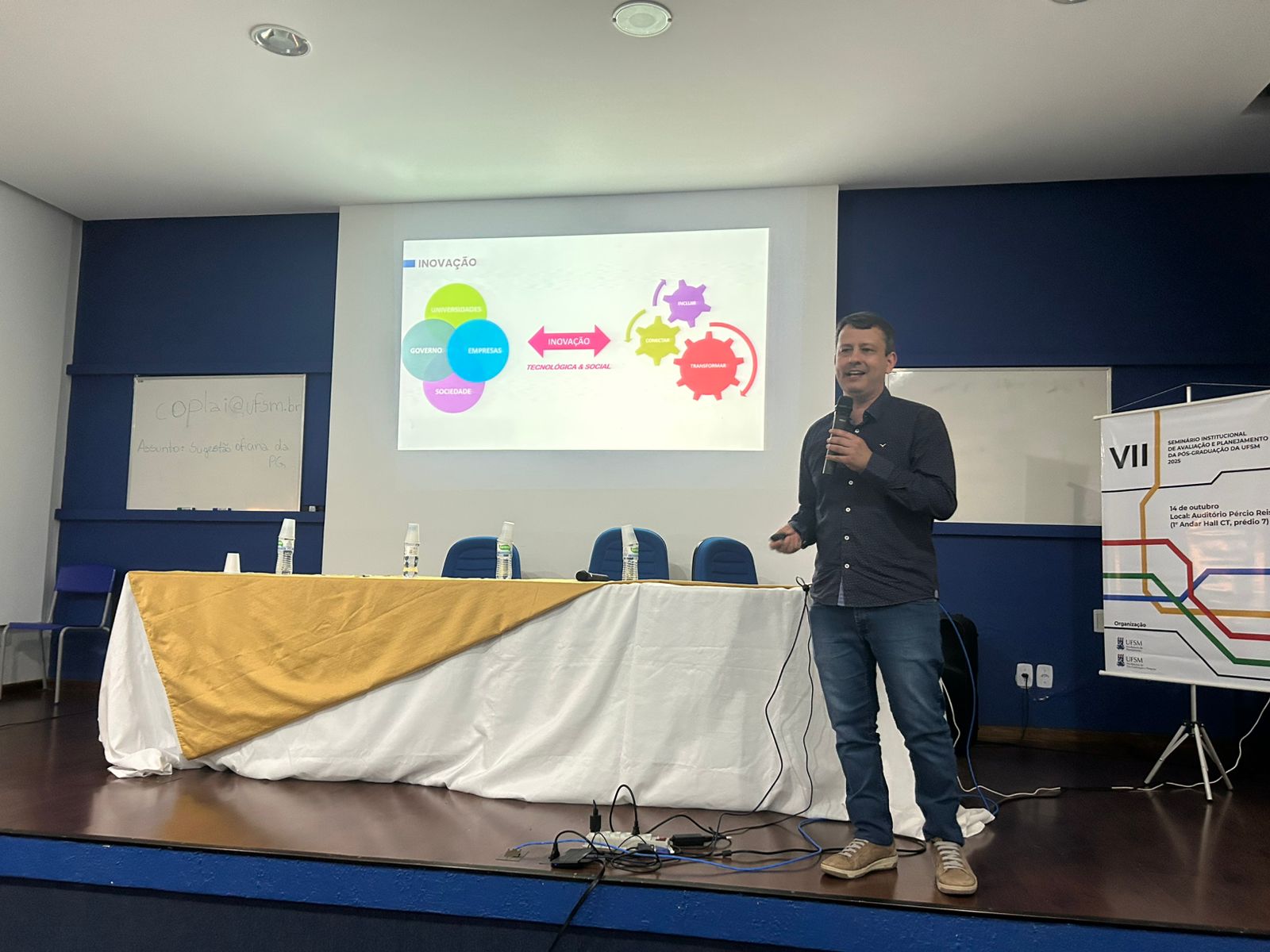 No dia 14 de outubro de 2025, a UFSM sediou o VII Seminário Institucional de Avaliação e Planejamento da Pós-Graduação, promovido pela Pró-Reitoria de Pós-Graduação e Pesquisa (PRPGP), em parceria com a Pró-Reitoria de Planejamento (PROPLAN), a Pró-Reitoria de Inovação e Empreendedorismo (PROINOVA) e a Diretoria de Relações Internacionais (DRI).