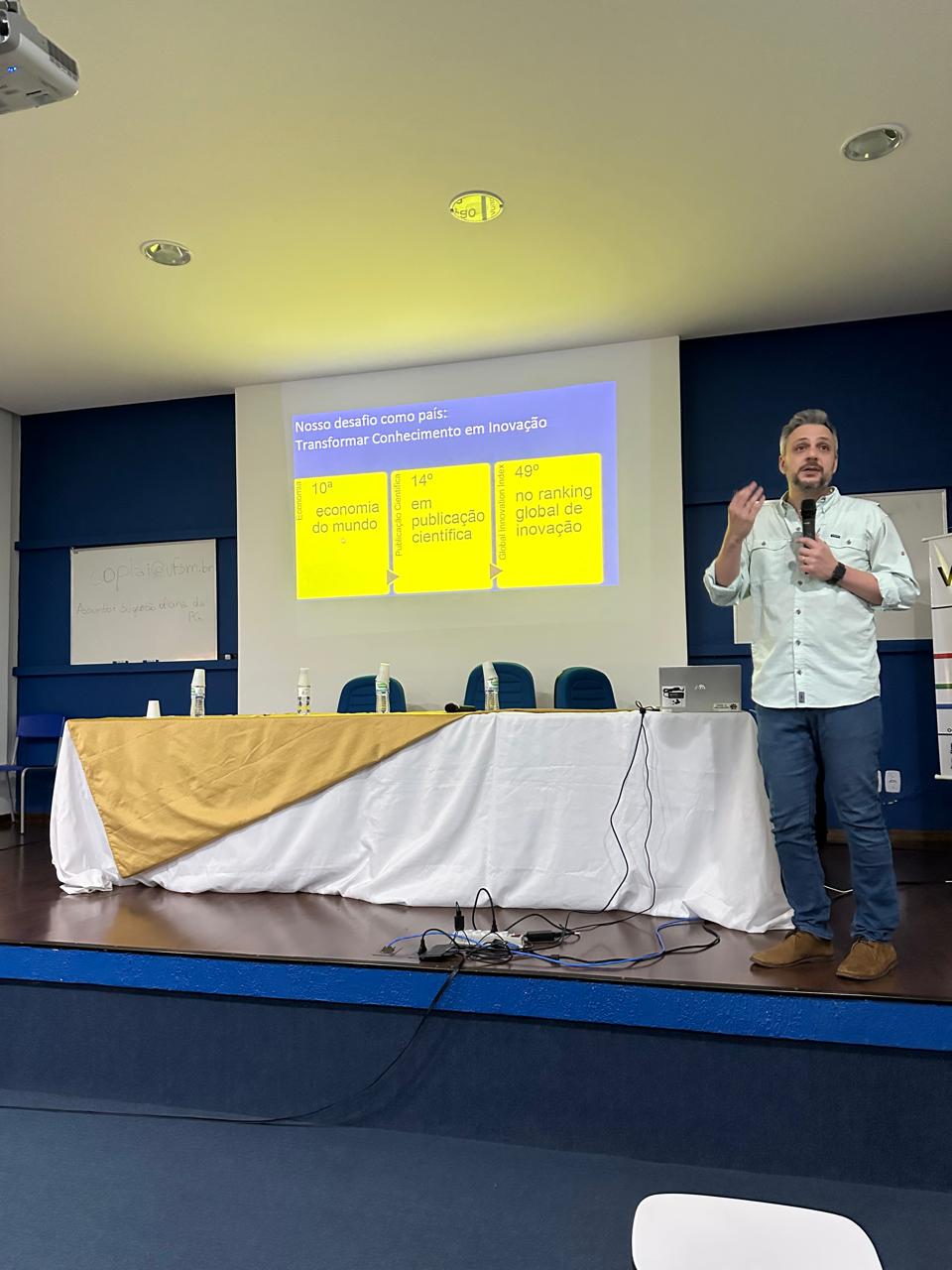 Em sua fala, o professor Daniel Bernardon apresentou os mecanismos de transferência tecnológica e as evidências do impacto das pesquisas desenvolvidas na UFSM, reforçando o papel estratégico da inovação na consolidação da pós-graduação como agente transformador da sociedade.