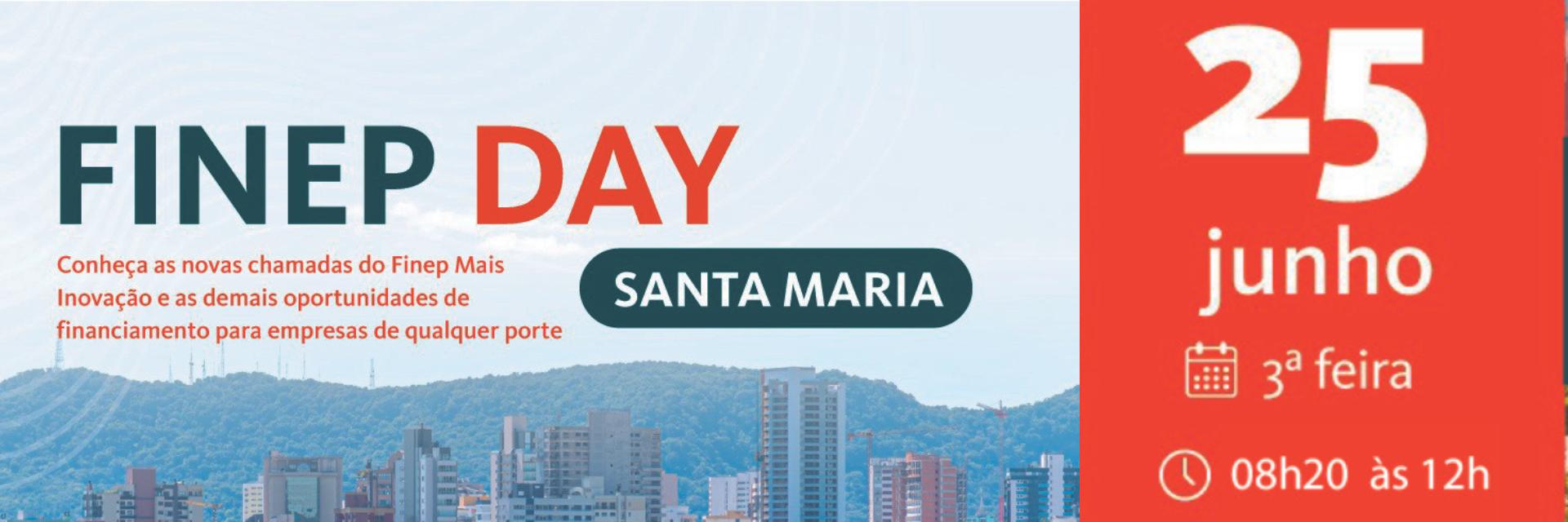 No dia 25 de Junho, das 8h40 às 12 horas, no Auditório do Instituto Nacional de Pesquisas Espaciais (INPE), acontecerá o Finep Day, edição Santa Maria. O evento é promovido pela Financiadora de Estudos e Projetos (Finep), agência pública vinculada ao Ministério da Ciência, Tecnologia e Inovação, que apoia a inovação e o empreendedorismo, em empresas e universidades, com o intuito de fomentar a cultura da inovação e o empreendedorismo no país.
