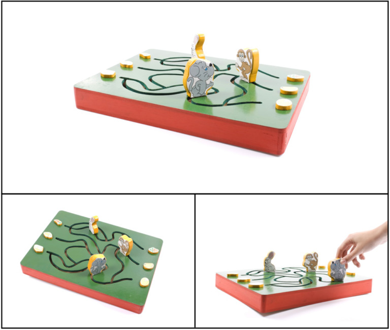 Caixa com vazados representando caminhos, onde há três peças, cada uma representando um animal (coelho, rato e macaco), que se movem livremente pelos caminhos. Na extremidade de cada um existem ilustrações de alimentos relacionados aos animais, sendo o objetivo mover o animal de uma extremidade a outra do caminho. Estimula a motricidade fina, trabalha com informações simples, do cotidiano, de fácil assimilação.