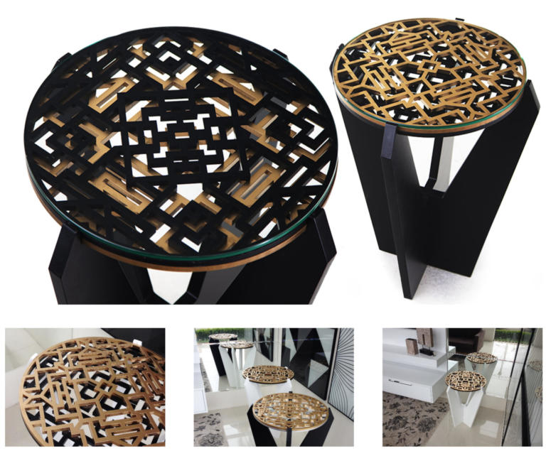 Trabalhou-se a união do design de superfície e de mobiliário, com o objetivo de desenvolver uma coleção de mesas laterais. O tema abordado é o Art Déco, que tinha por essência o exagero de ornamentos e as formas geométricas. O resultado cumpriu a proposta inicial, gerando a coleção de mesas, possuindo base em modelo único (formado apenas por encaixe, sem elementos de fixação) e seis tampos intercambiáveis, que também são encaixados na base. Os tampos possuem recortes com desenhos característicos do movimento, e podem ser sobrepostos ou trocados, gerando imagens únicas. Para facilitar o uso, uma lâmina de vidro fecha o conjunto.