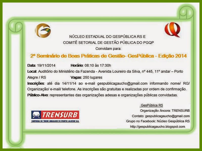 A PROPLAN convida os servidores da UFSM a participarem do 2º Seminário de Boas Práticas de Gestão, promovido pelo Núcleo do Gespública RS, no dia 19 de novembro. As inscrições são gratuitas. Esta é uma excelente oportunidade para conhecer práticas e resultados positivos, com ações e controles ajustados à realidade social, bem como motivar-se para a atuação em prol da inovação e da melhoria da gestão.