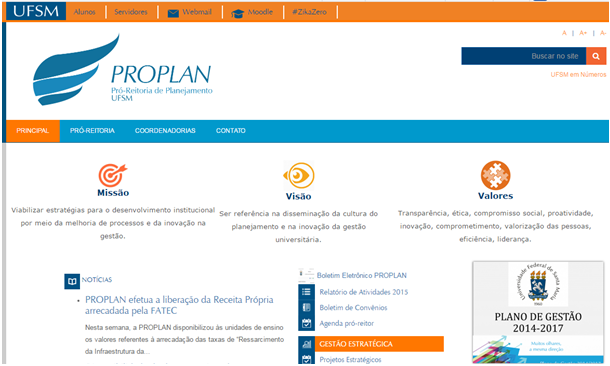 Estes estão disponíveis na página inicial da PROPLAN, para que, além dos servidores, a comunidade possa conhecer os propósitos da Pró-Reitoria.