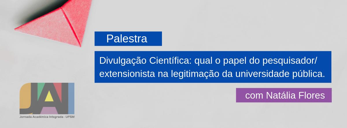 No dia 25 de outubro, durante a programação da Jornada Acadêmica Integrada (JAI), a doutora em Comunicação Natália Flores ministrará uma palestra sobre Divulgação da ciência: o papel do pesquisador/extensionista na legitimação da universidade pública. O evento ocorrerá às 16 h no Auditório do prédio 74C (2º andar), tem entrada franca e é voltado aos servidores pesquisadores/extensionistas e comunicadores da instituição.
