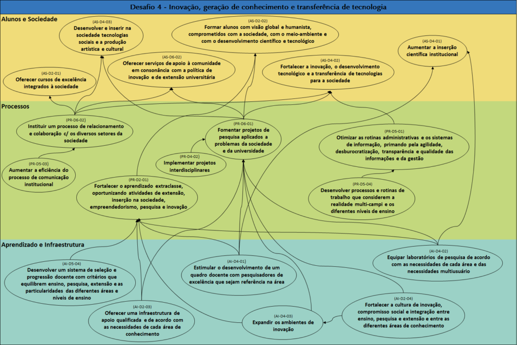 O Desafio 4 – Inovação, Geração de Conhecimento e Transferência de Tecnologia contém 20 objetivos estratégicos, sendo que seis estão na dimensão Alunos e sociedade, sete estão na dimensão Processos, outros seis estão na dimensão Aprendizado e infraestrutura e há também um objetivo na dimensão Sustentabilidade financeira.