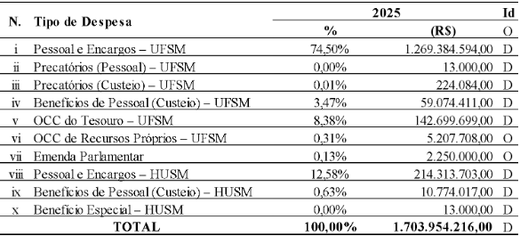 A Lei Orçamentária Anual (LOA) para Exercício de 2025, n° 15.121, de 10.04.2025, publicada no DOU de 10.04.2025, destinou à Universidade Federal de Santa Maria - UFSM (UO 26247) um orçamento de R$ 1.478.853.496,00 (Um bilhão, quatrocentos e setenta e oito milhões, oitocentos e cinquenta e três mil, quatrocentos e noventa e seis reais) e ao Hospital Universitário de Santa Maria - HUSM (UO 26387) um orçamento de R$ 225.100.720,00 (Duzentos e vinte e cinco milhões, cem mil, setecentos e vinte reais), totalizando R$ 1.703.954.216,00 (Um bilhão, setecentos e três milhões, novecentos e cinquenta e quatro mil, duzentos e dezesseis reais). Obedecendo ao que segue: