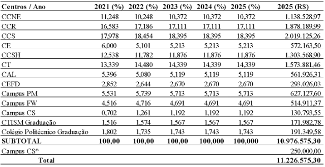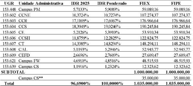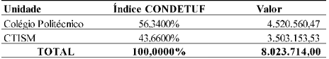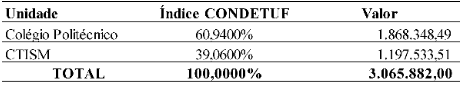 3.5.1.2 Com base no cálculo do IDR, os Fundos de Incentivo à Extensão - FIEX e de Incentivo à Pesquisa - FIPE serão calculados de forma ponderada, desconsiderando os índices do CTISM e do Colégio Politécnico, que farão aportes dentro da matriz CONDETUF, dentro de sua disponibilidade orçamentária, ficando a distribuição para esses fundos conforme a tabela a seguir.