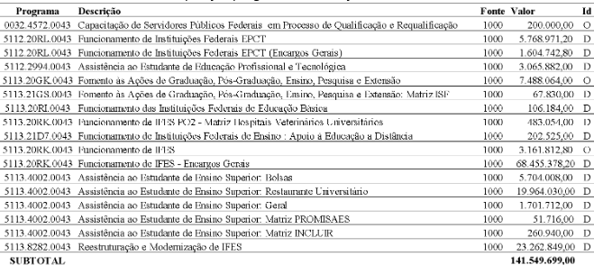 Legenda: Id D são destaques (matriz com finalidade definida) Id O são outras despesas de custeio e capital (matriz com finalidade discricionária)