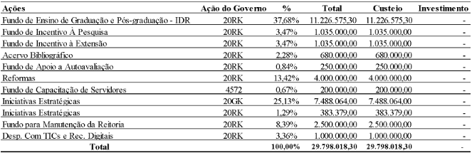 3.5.1 Os Fundos de Ensino de Graduação e Pós-Graduação – IDR no valor de R$ 11.226.575,30 (Onze milhões, duzentos e vinte e seis mil, quinhentos e setenta e cinco reais e trinta centavos), o Fundo de Incentivo à Pesquisa, no valor de R$ 1.035.000,00 (um milhão e trinta e cinco mil reais), e o Fundo de Incentivo à Extensão, no valor de R$ 1.035.000,00 (um milhão e trinta e cinco mil reais), serão distribuídos considerando os índices abaixo relacionados na apuração do índice de participação das Unidades de Ensino nos recursos de "Outras Despesas Correntes e Despesas de Capital", atribuindo-lhes os seguintes pesos, considerando-se ainda um redutor de impacto na ordem de 1,0 (um) ponto percentual.