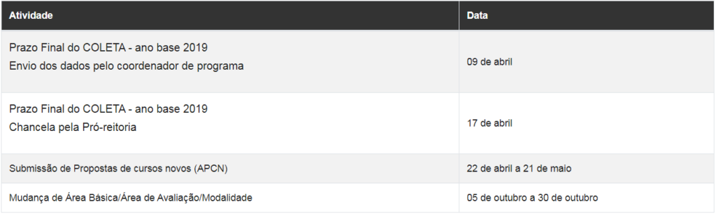 O calendário de atividades da Diretoria de Avaliação para 2020 foi publicado nesta quarta-feira, 27, no Diário Oficial da União. A Portaria nº 252 de 2019 estabelece os prazos finais do Coleta, a submissão de propostas para Avaliação de Proposta de Cursos Novos (APCN) e a Mudança de Área Básica, de Avaliação ou Modalidade.