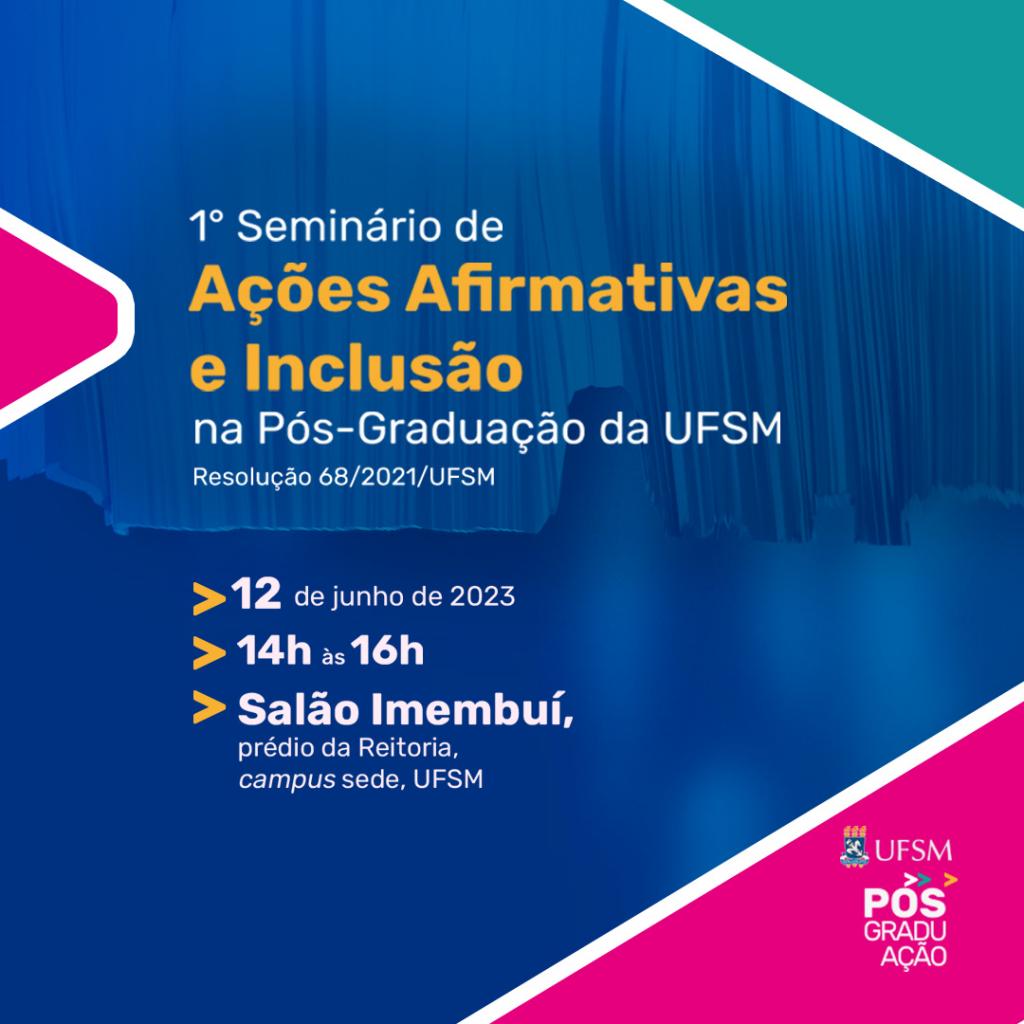 Considerando a aprovação e implantação da Política de Ações Afirmativas e Inclusão na Pós-Graduação da UFSM (Resolução 68/2021/UFSM), a PRPGP juntamente com o NEABI e a CODERC/PRE, tem a honra de convidá-los a participar do I Seminário de Ações Afirmativas e Inclusão da UFSM, a realizar-se no dia 12 de junho de 2023, das 14 às 16h, no Salão Imembuí, prédio da Reitoria, campus sede, UFSM. O convite é extensivo aos membros do colegiado dos cursos, docentes e servidores que tenham interesse no tema.